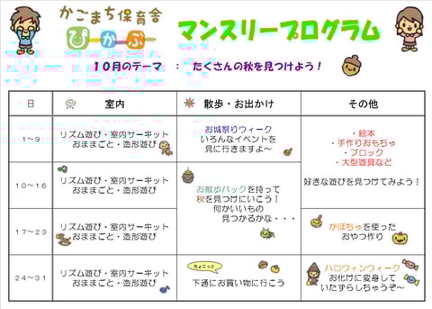さて、10月よりマンスリープログラムを作成することにいたしました。今月のテーマは「たくさんの秋を見つけよう!」。お散歩で落ち葉や木の実を拾ったり、お城祭りイベントに参加してみたり・・・何かと外出する機会が多くなりそうです。一時預かりの方も、できる限り参加いただけるよう、実施時間は柔軟に考えておりますので、予約の際は気軽にお尋ねください。